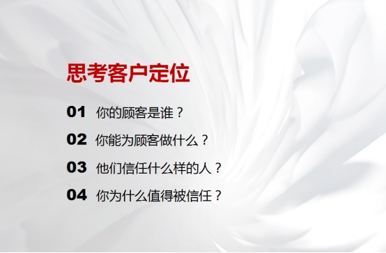 第二:從客戶定位的角度出發(fā),思考4點:你的顧客是誰?你能為顧客做什么?他們信任什么樣的人?你為什么值得被信任?